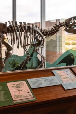 The Visitor Center features interpretive displays covering dinosaurs and the internment camp, as well as details about the park’s monthly events.