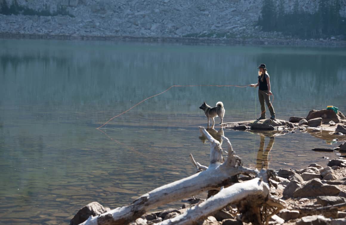 Yoda Bear is a Norwegian elkhound. They are friendly, independent working dogs that I’m told were bred for stamina. Yoda had recently accompanied the Grants on a 110-mile traverse of the Wind River Range in Wyoming, so clearly it is not an exaggeration. While we fish Kamas Lake, Yoda takes off on his own on a circumnavigation of the lake. I watch as Yoda becomes a tiny dot on the opposite shoreline, equally at home in the backcountry as his humans.