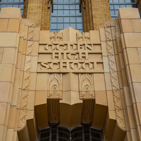 Between these two projects, Hodgson completed his magnum opus: Ogden High School. The school uses similar materials but features more elaborate exterior and extensive interior Art Deco details. Montgomery told me what this school meant to the community: “It was the [nation’s] first million-dollar high school. Those that went to Ogden High had a brand-new school with all the bells and whistles and suddenly had a standing in the state.”