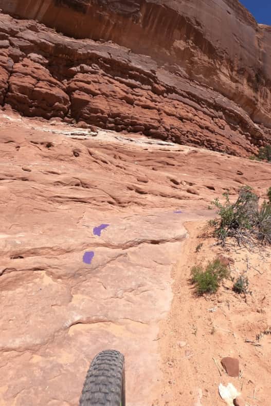 Although the trails are connected, Big Mesa and Ramblin look and feel more like cousins than siblings. Both are blue trails that run 3.3 miles each, but Ramblin moves away from the mesas that rise from the plateau offering a rollercoaster of smooth slickrock that just ... doesn’t ... seem ... to ... end, but when it does, it is usually for a few manageable rocks that, like an E-ticket amusement, have you click, click, clicking up to the apex before gravity takes you down again. The parking lot then appeared but much higher than it seemed it should be. We knew our Ramblin spin was over when trail markers painted on the rock pointed almost vertically toward the exit forcing us to walk the remainder and, between breaths, debate whether to order fries with our much-earned Atomic Burger.