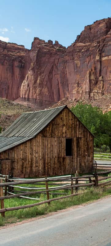 The families who lived in Fruita gradually left over the ensuing years. The last private resident, Dewey Gifford, sold his house to the National Park Service and moved away in 1969. Two years later, Capitol Reef was established as a national park. Today the park’s visitors can tour Gifford’s homestead and barn. Surrounded by the grand brick-red walls of rock, it makes for a scenic place to pick some fruit from the orchard next door, buy freshly baked pie or bread from the store, and settle down for a picnic.