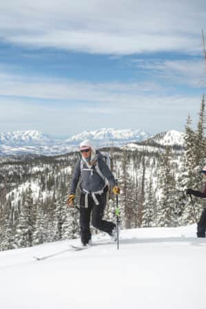 The rhythm of my breath corresponds with each forward slide of my skis as I make my way to the ridge where Shaun Deutschlander and Rachael Burks stand waiting. They’ve got grins plastered on their faces and once I reach them and look up from the skin track, I understand why.