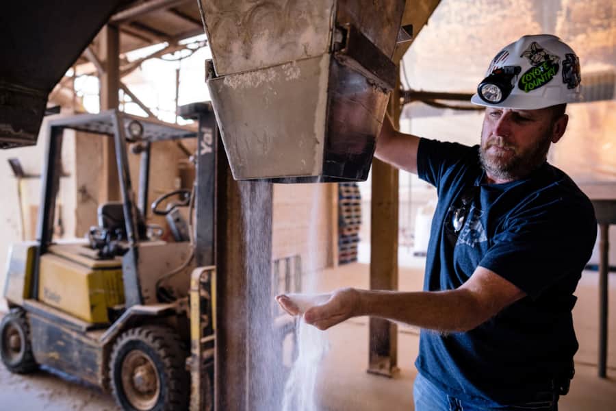 A track excavator powers a drum equipped with carbide teeth to provide a powerful amount of friction against the walls of salt. It piles more than 10 feet high. The salt is taken above ground to be crushed and screened — then it’s shipped to Heber for packaging.