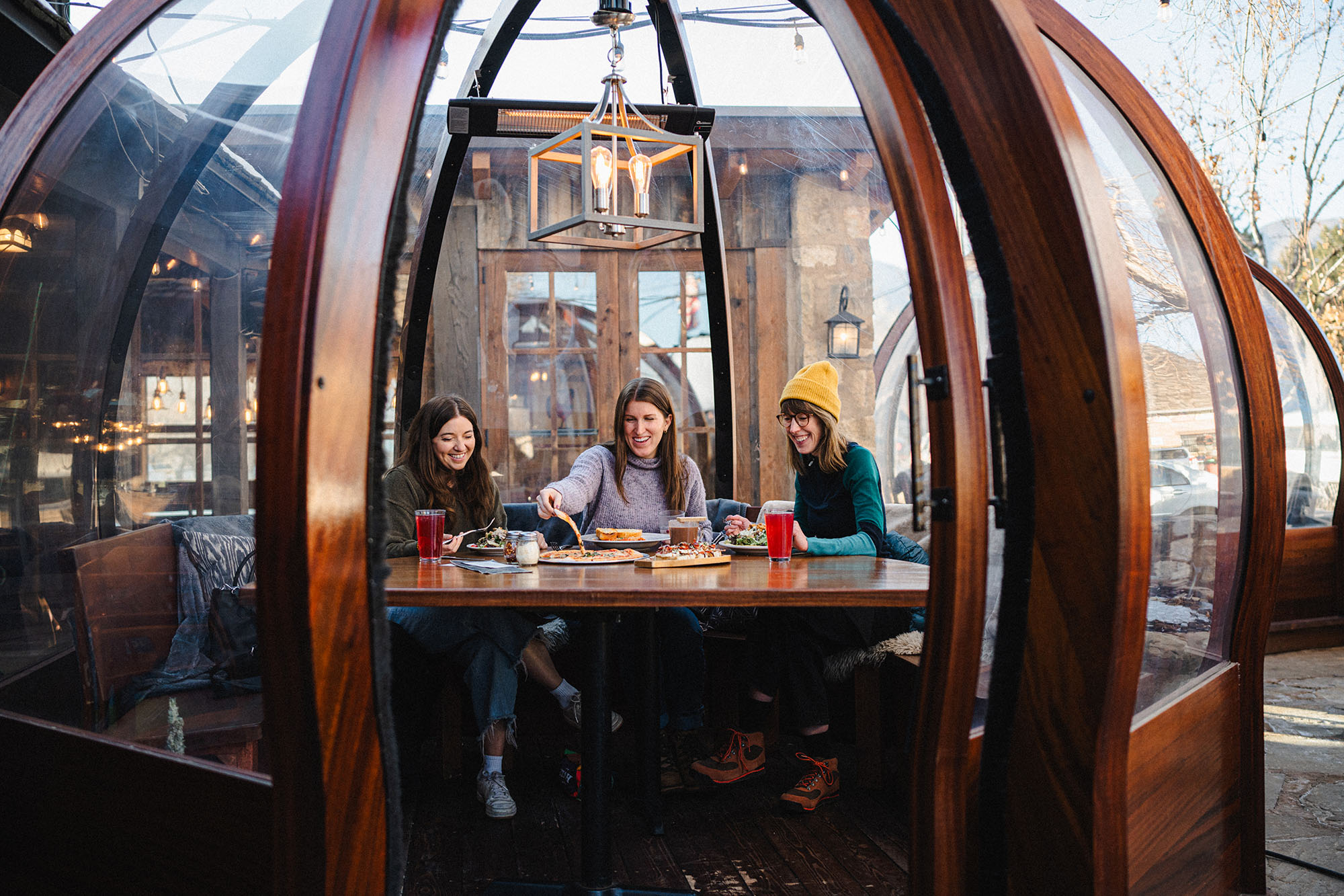 Up your dining game with a stop at the Alpenglobes at Café Galleria in Midway, which gets particularly festive on a snowy evening.