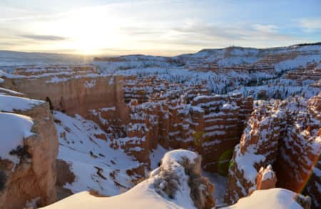 Prepare for cold and snow, and be sure to check current conditions as well as the weather forecast before planning your journey. Normally, winter daytime highs are slightly above freezing, but be prepared for cold snaps. Bryce Canyon’s winter temperatures have plunged as low as -26 degrees Fahrenheit, and subzero temperatures can occur during any winter month. Plan for a snowy visit. The park typically receives just under 100 inches of snow a year, though one year 82 inches of snow fell in January alone. Expect freezing temperatures most nights from October through May, with the possibility of snow. December through February is typically the time of year with the coldest temperatures and most snow, though March and April snowstorms can also be significant.