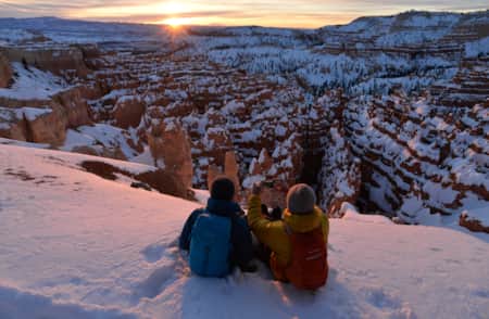Bryce Canyon provides amazing opportunities for winter snowshoeing. Many visitors prefer the relatively flat terrain of Paria View Road, Fairyland Point Road and the Rim Trail open sections. Ranger guided snowshoe hikes are a great way for adults and kids ages 8+ to explore the park while learning about topics like winter ecology and geology. Full-moon snowshoe hikes are also very popular. Contact the park for more details. If the snow is too packed down and icy for a snowshoe, try a winter hike with sturdy boots and “over the shoe” traction devices. Additionally, the park recommends traction devices be used on all paved areas, which can also become very slippery in winter. Contact the park for current conditions.