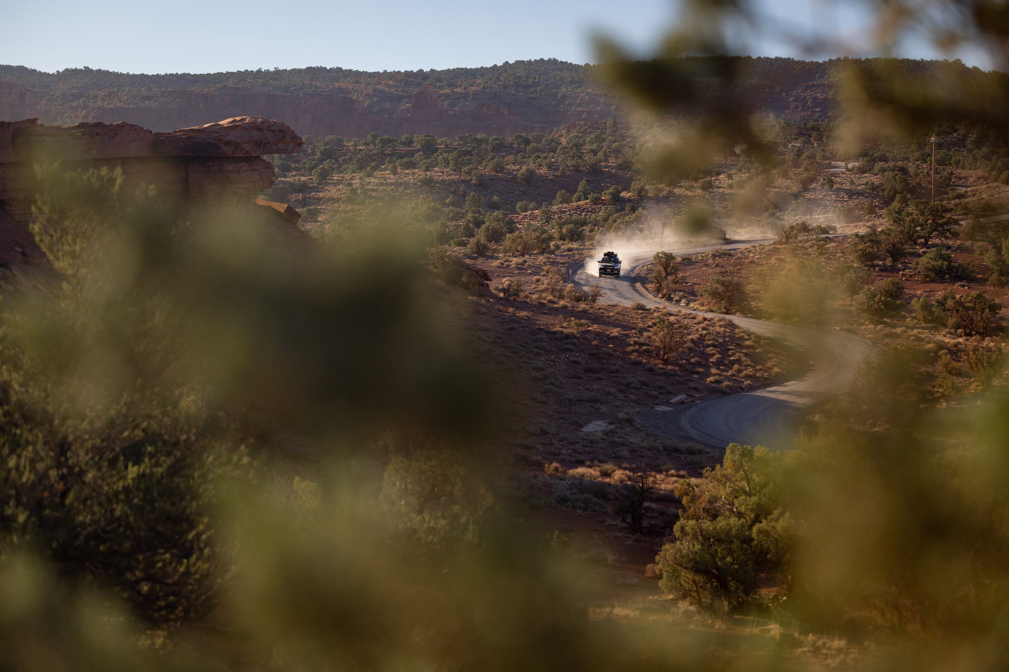 The road ahead (which can be slippery if not impassable when wet) ascends the shallow drainage of Long Canyon. Pass over the fifth and final cattle guard after 2.5 miles and cross the wash one last time at 3.1 miles. After the road tops out on the broad sandy plateau of West Clark Bench at 4.2 miles, pass the first of several right-branching roads, and bear left at all but one junction ahead. This point is generally the end of road maintenance, so expect challenging driving conditions ahead.