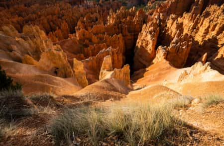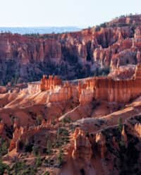 An alpine forest with as many red rock hoodoos as trees. At dawn and dusk, mule deer graze the forested plateau along the road into Bryce Canyon.