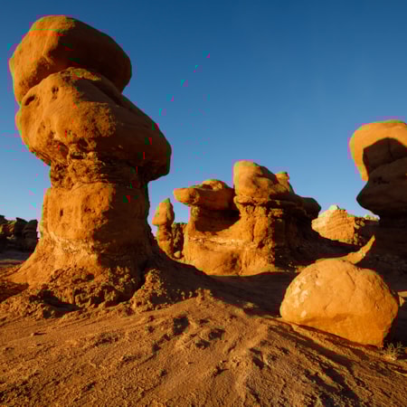 The day’s big feature is Goblin Valley State Park (pictured). The thousands of towering, delicate hoodoos call to mind the ancient seabed of an alien planet, and the park’s remote location only adds to that reputation. Step carefully, though, though these hoodoos have stood the test of time, they are remarkably fragile. This is also your first chance to try out a canyon adventure; five miles west of the park lies Little Wild Horse Canyon, a perfect slot canyon for families to explore and get a taste of canyoneering (without ropes required). Once you return to Earth, it’s time to dip your toes into Capitol Reef National Park, exploring the northern edge of the park on the way to Torrey for dinner and rest before a big day tomorrow.
