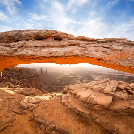Imagine wave after wave of deep canyons, formed by the currents and tributaries of Utah's Green and Colorado rivers, divided with towering mesas, pinnacles, cliffs and spires, and spread out over tens of thousands of acres of some of the world's most breathtaking red rock country. Though Canyonlands National Park is made up of three distinct land districts, today focuses on the photogenic Island in the Sky and neighboring Dead Horse Point State Park. Camp in the parks or return to Moab.