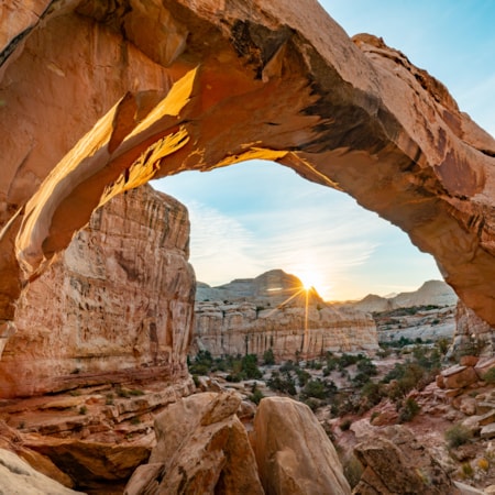 The contrast of red Entrada and white Navajo sandstones and the magnificent warp in the crust of the Earth create surreal landscapes unlike any you have seen. Capitol Reef National Park splashes color for 100 miles through an inviting wilderness of sandstone formations, rock art petroglyphs telling the story of the early indigenous people of the Fremont Culture, and the large fruit orchards of Fruita, an early pioneer settlement. With a high-clearance vehicle, you can explore the backcountry, but there’s also plenty to see and miles of unique trails in the front country along S.R. 24 and the Capitol Reef Scenic Drive. Overnight in Torrey.