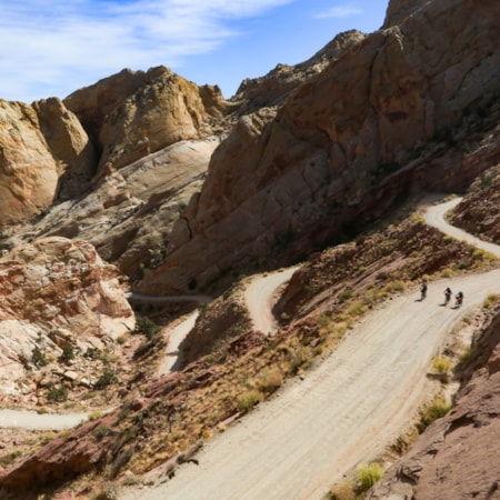 Today completes a full-day backcountry loop through a defining feature of Capitol Reef: the Waterpocket Fold. Turn down the All-American Road Scenic Byway 12 and consider a stop to explore the expansive timbered plateau of Boulder Mountain. At Boulder, veer east down the Burr Trail. It starts paved then turns to gravel before dropping down some eye-popping switchbacks into the national park. Turn north on Notom Road to complete your backcountry tour of Capitol Reef. Back on S.R. 24 you’ll head northeast toward the San Rafael Swell’s introduction to canyoneering: Little Wild Horse and Ding & Dang canyons.