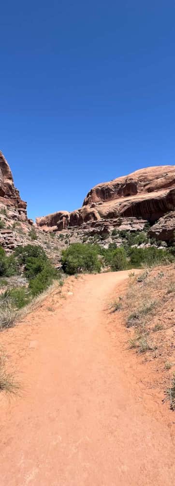 Half a mile from where you crossed the stream is the sixth longest natural rock span in the United States, Morning Glory Natural Bridge. The bridge’s 243-foot span is set close against this rocky amphitheater, and you will get the best view of the bridge by going underneath it.