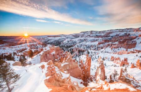 See red rock hoodoos coated with a dusting of snow against a stunning scenic backdrop on an unforgettable winter visit to Bryce Canyon National Park.